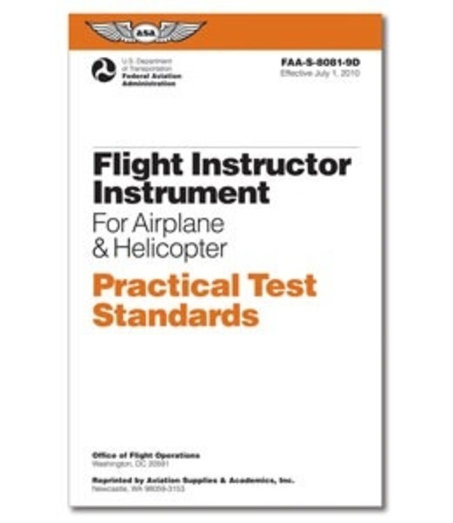 The Practical Test Standards are a guide for students instructors and FAA-designated examiners to know what is expected of pilots in a checkride. ASA reprints the most current FAA Practical Test Standards in this series of handy cockpit-sized guides. Every PTS is written by the FAA and details the type and levels of skill and knowledge that must be demonstrated before an examiner can issue a certificate or rating to an applicant and describes background study and reference materials.